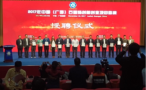11月10-11日,山東玉皇新能源科技有限公司受邀參加了在廣西鹿寨舉行的2017年中國(廣西)石墨烯創(chuàng)新成果交流展示會,本次展示會由中國石墨烯產(chǎn)業(yè)技術(shù)創(chuàng)新戰(zhàn)略聯(lián)盟聯(lián)合廣西科協(xié)、廣西工信委、廣西投促局、柳州市人民政府共同主辦,鹿寨縣人民政府承辦。我公司代表石墨烯事業(yè)部負(fù)責(zé)人王麗博士參加交流展示會,并受聘為路演項目企業(yè)評委。