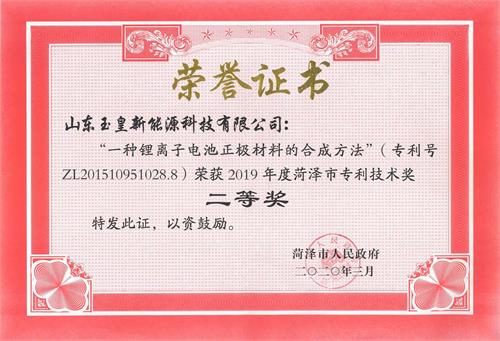 近日,玉皇新能源發(fā)明專利“一種鋰離子電池正極材料的合成方法”榮獲2019年度菏澤市專利技術(shù)獎二等獎。